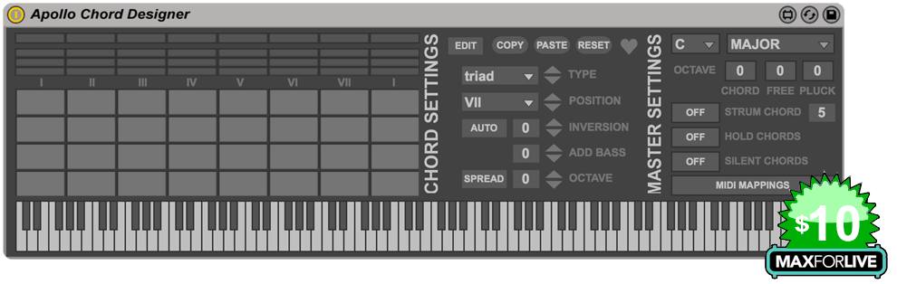 If you snoozed through music theory classes, then this MIDI effect device is for you. Use preset chords or create custom ones, pluck notes of the chord manually, and use 3 octaves of "free play" keys to always play in key. Can be used with or without controller. Includes mapping profiles for grid controllers, and ability to create your own mappings to work with any other controller.