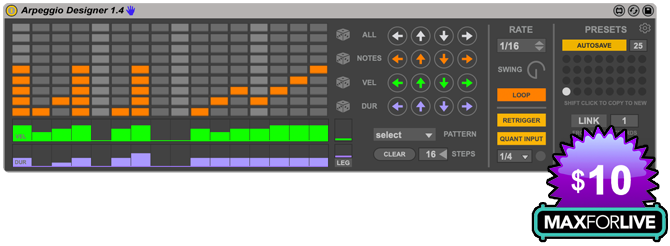 Ever wanted your Ableton arpeggiator to do more? Now it can! Arpeggio Designer gives each of your held notes its own sequencer lane, with velocity and duration per step. It can be used monophonically or polyphonically, and pairs very well with Apollo Chord Designer.